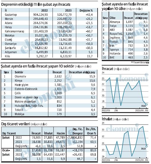 İşlenmemiş altın ithalatı yüzde 858,7 arttı Şubat ayı ithalatının ise 30,8 milyar dolar olurken, bu rakamın yüzde 22’si enerji ithalatı kaynaklı olduğuna dikkat çekilerek, “Ayrıca, ithalattaki artış önemli oranda işlenmemiş altın ithalatından kaynaklanmaktadır. Nitekim bu dönemde işlenmemiş altın ithalatı 3,7 milyar dolar artarak (%858,7 artış) 4,1 milyar dolar olarak gerçekleşmiştir. 2023 Şubat ayında ithalattaki artışta öne çıkan ürün grupları arasında otomotiv ithalatı yarı iletken krizinin aşılmasından dolayı yüzde 81 artışla 2,1 milyar dolar, makine ithalatı yüzde 22,2 artışla 2,9 milyar dolar, elektrikli makineler ithalatı yüzde 40,5 artışla 2,1 milyar dolar olarak gerçekleşmiştir. 2021 yılı itibarıyla, depremden etkilenen 11 ilimizin Türkiye GSYH’si içindeki payı yüzde 9,8’dir. Depremin illerin ekonomisinde yol açtığı tahribatın ivedilikle aşılması amacıyla gerekli tedbirler hayata geçirilmekte olup, depremden etkilenen işletmelerimizi tekrar ayağa kaldırmak üzere kısa, orta ve uzun vadeli ihtiyaçlar kapsamında çalışmalar yapılmaktadır” ifadelerine yer verildi.