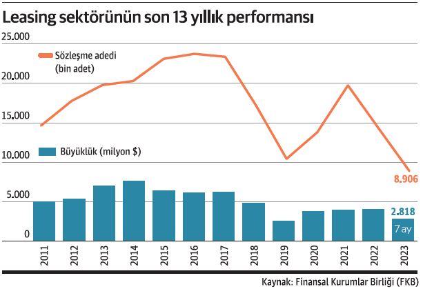 Banka dışı finansman sektörünün yüksek işlem hacmine sahip alanlarından leasing, pandeminin olumsuz etkisinden kurtuluyor. 2018’de 4.7 milyar dolarlık işlem hacmine ulaşan sektör, 2019’da iş hacmini 2.5 milyar dolara kadar düşürmüştü. 2022 yılında ise 4.2 milyar dolar seviyesinde işlem hacmine ulaştı. 2023 Temmuz sonu işlem hacmi ise toplam 2.8 milyar dolar olarak gerçekleşti. Sözleşme adetlerinde ise 2023 Temmuz sonu 8 bin 906 adet sözleşme imzalandı. Geçen yıl temmuz sonu bu rakam 8 bin 499 adetti. Rakamlara bakıldığında, sektörün global ekonomik durgunluk, seçim vb. dış etkenlere rağmen finansman sağlamaya ve müşteri ihtiyaçlarına hızla cevap vermeye devam ettiğini söyleyebiliriz.