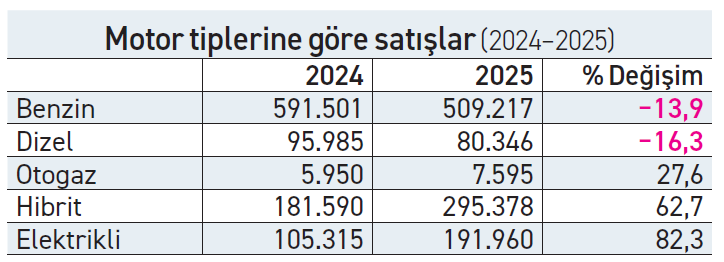 2025 yılında benzinli otomobil satışları yüzde 13,9 düşüşle 509.217 adede gerilerken, dizel segmenti yüzde 16,3 daralarak 80.346 adetle sınırlı kaldı. Otogazlı modellerde sınırlı da olsa artış görüldü. Buna karşılık hibrit otomobiller 295.378 adetle tarihsel zirveye çıktı. Hibrit satışları bir yılda yüzde 62,7 artış kaydederken, bu segmentin pazar payı yüzde 27,2’ye yükseldi.