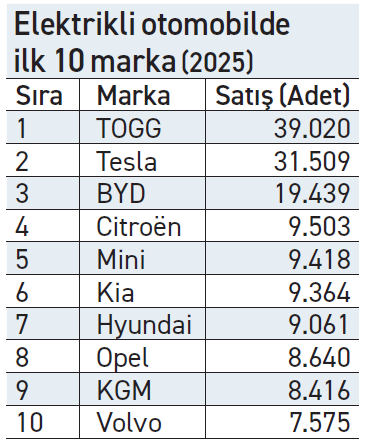Ocak–Aralık 2025 döneminde Türkiye’de elektrikli otomobil satışları yüzde 82 artarak 191.960 adet olarak gerçekleşti. Böylece elektrikli otomobillerin toplam pazardaki payı yüzde 17,7’ye çıktı. Elektrikli araç pazarındaki büyümenin ana sürükleyicileri yerli üretici TOGG, küresel markalar Tesla ve BYD olurken, Avrupa merkezli üreticiler de rekabette ağırlığını artırdı.