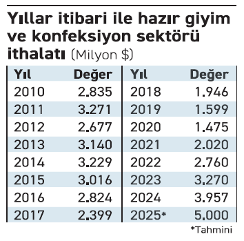 Konfeksiyon sektöründe ihracat kaybı gündemdeki yerini korurken, ithalattaki sert yükseliş dengeleri daha da zorluyor. Türkiye’nin hazır giyim ithalatı, baskılanan döviz kuru ve yurt dışına kayan üretimin etkisiyle son yıllarda hızlı bir artış trendine girdi. 2024’ü 3 milyar 957 milyon dolar ile kapatan ithalatın, 2025 yılı sonunda 5 milyar dolar bandına ulaşarak tarihi bir rekora imza atması öngörülüyor. Türkiye Giyim Sanayicileri Derneği’nin TÜİK ve TİM verilerinden derlediği bilgilere göre Türkiye’nin hazır giyim ithalatı son 15 yılda dalgalı ancak yukarı yönlü bir seyir izledi. 2010 yılında yaklaşık 2,8 milyar dolar seviyesinde bulunan ithalat, 2011’de 3,27 milyar dolara yükseldi. 2014 yılında 3,23 milyar dolar ile zirveye yaklaşan ithalat, 2018–2020 döneminde gerileyerek 2020’de 1,47 milyar dolara kadar düştü. Ancak 2021 sonrası tablo tersine döndü. 2021’de 2 milyar dolar seviyesine çıkan ithalat, 2022’de 2,76 milyar dolar, 2023’te 3,27 milyar dolar ve 2024’te 3 milyar 957 milyon dolar ile son yılların en yüksek seviyesine ulaştı. Türkiye istatistik Kurumu verilerine göre 2025 yılının 10 aylık döneminde ise hazır giyim ithalatı bir önceki yılın aynı dönemine göre yüzde 25 artışla 3 milyar 228 milyon dolardan 4 milyar 160 milyon dolar seviyesine yükseldi. Mevcut eğilim korunması ve yıl sonunda 5 milyar dolarlık bir ithalat hacmi öngörülüyor.