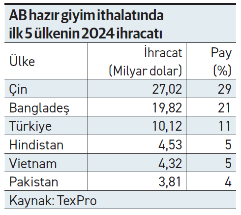 Eurostat verilerine göre AB-27’nin hazır giyim ithalatı, 2022’de 113 milyar Euro iken bu rakam, 2023’te 95 milyar Euro’ya, 2024’te ise 96,9 milyar Euro’ya düşmüştü. Türkiye’den AB’nin hazır giyim ithalatı içindeki payı ise 2024’te yüksek maliyetlerden kaynaklanan fiyat rekabeti nedeni ile yüzde 6,5 düşüşle 10,4 milyar Euro’ya gerilemişti. Geçen yılın 10 aylık döneminde ise bölgenin hazır giyim ithalatı yüzde 3,4 artışla 98,2 milyar Euro’ya çıkarken Türkiye hazır giyim sektörünün bölgeye ihracatı yüzde 10,6 düşüşle 7,9 milyar Euro’ya geriledi.