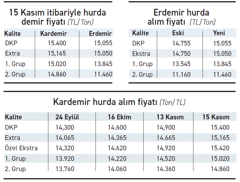 Erdemir de 15 Kasım itibariyle geçerli olmak üzere hurda alım fiyatını ton başına 300 lira artırdı. Erdemir, 14 bin 755 liradan aldığı DKP kalite hurdanın tonunu 15 bin 55 liradan, 14 bin 750 lira olan Ekstra hurdanın tonunu 15 bin 50 liradan, 13 bin 545 lira olan 1 grup hurdanın tonunu da 13 bin 845 liradan alacak.