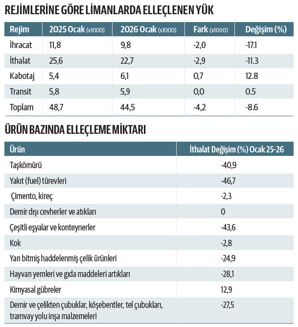 Ocak ayında toplam yük elleçlemesi geçen yılın aynı dönemine göre yüzde 8,6 gerileyerek 48,6 milyon tondan 44,4 milyon tona düştü. Tonaj kaybı 4 milyon tonu aştı. İhracatta yüzde 17,1 gerileme yaşanırken ithalattaki kayıp yüzde 11,3’e çıktı. Bu dönemde konteyner hacmi ise yıllık yüzde 6,6 daraldı.