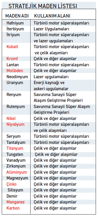 Raporda stratejik madenlerin, kritik madenlerin sahip olduğu özelliklere ek olarak savunma sanayinde kilit role sahip olma niteliğine de sahip olduğuna dikkat çekilerek; “Stratejik madenlere talep çok daha az olabilir ancak eksikliği ya da tedarik zincirinde meydana gelecek bir aksaklık kısa süre içerisinde bir güvenlik zafiyetine sebep olabilir. Belirlenen 26 stratejik madenin 10 tanesi (kobalt, krom, molibden, titanyum, nikel, niyobyum, alüminyum, çinko, demir, manganez) hem kritik hem de stratejik maden olarak belirlendi.” ifadesi kullanıldı. Listede nadir toprak elementlerinden lantan, seryum, neodimyum, herbiyum ve itriyum yer aldı.