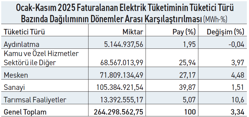 Ocak-Kasım 2025 dönemi bir önceki yıla göre, sanayide yüzde 1,51 artarken, kamu kurumları dahil hizmet sektörü yüzde 3,97, meskenler yüzde 4,48 ve tarımsal sulama yüzde 10,67 daha fazla elektrik tüketti. Genel olarak ise tüketilen elektrik, 2025 11 aylık döneminde, bir önceki yıl aynı döneme göre yüzde 3,34 arttı.