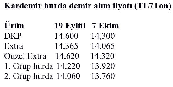 Eylül başında üst üste hurda demir alım fiyatında artıran Kardemir, bu kez tüm hurda ürün alımlarında fiyatı ton başına 300 TL düşürdü. Şirket 9-24 Eylül tarihleri arasında tonunu 14 bin 600 TL’den aldığı DKP hurdanın tonunu 14 bin 300 TL’ye düşürdü. Diğer ürün gruplarında da fiyat düşüşü yaşandı. Extra’nın tonu 14 bin 365 liradan 14 bin 65 liraya, 1. Grup hurdanın tonu da 14 bin 200 liradan 13. 920 liraya ve 2. Grup hurdanın tonu da 14 bin 60 liradan 13,760 liraya geriledi.