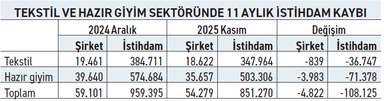 Hazır giyim sektöründe ise daralma çok daha belirgin seviyelerde gerçekleşti. 2024 Aralık ayında 39 bin 640 olan şirket sayısı, 2025 Kasım itibarıyla 35 bin 657’ye geriledi. Böylece 3 bin 983 hazır giyim şirketi 11 ayda faaliyetini sonlandırdı. İstihdam tarafında da kayıplar hızlandı. Sektörde çalışan sayısı 574 bin 684 kişiden 503 bin 306 kişiye düştü. Bu gerileme, 71 bin 378 kişinin hazır giyim sektöründen ayrıldığını ortaya koydu. Toplam istihdam kaybının yaklaşık üçte ikisi hazır giyim sektöründe yaşandı.