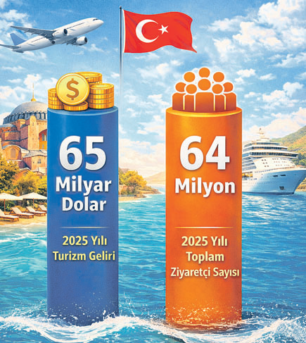 Türk turizm sektörüne 2025 yılına hızlıca bir bakacak olursak, şu noktalar öne çıkıyor: Türkiye’nin turizm geliri 2025 yılında yaklaşık 65 milyar doların üzerine çıkarak tarihi zirvesini yeniledi. Gelir artışında hem ziyaretçi sayısındaki yükseliş hem de kişi başı harcamadaki artış etkili oldu. Toplam ziyaretçi sayısı 64 milyon seviyesine yaklaşarak bir önceki yıla göre artış gösterdi. Yabancı ziyaretçiler toplam içinde ağırlığını korurken, yurt dışında ikamet eden vatandaş ziyaretleri de önemli katkı sundu. Kişi başı ortalama harcama yükseliş eğilimini sürdürdü. Harcama kalemlerinde yeme-içme, konaklama ve uluslararası ulaştırma ilk sıralarda yer aldı. En fazla ziyaretçi gelen ülkeler arasında Rusya, Almanya ve Birleşik Krallık ilk sıralarda yer aldı. Avrupa pazarının ağırlığı sürerken, Orta Doğu ve BDT ülkelerinden gelen talep de dikkat çekti. En çok ziyaret edilen destinasyonlar arasında İstanbul ve Antalya başı çekerken, Ege kıyıları ve kültür turizmi merkezleri de yüksek doluluk oranlarına ulaştı.