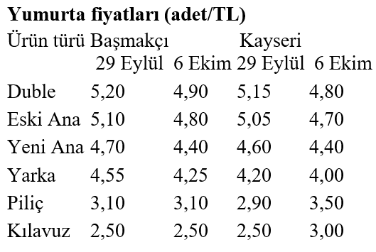 Afyon’da geçen hafta 5,20 lira olan duble yumurtanın tanesi bu hafta 4,90 liraya, Kayseri’de de 5,15 liradan 4,80 liraya geriledi. Eski ana yumurtada da her iki merkezde 30 kuruşluk düşüş yaşandı. Yarka yumurtada ise Afyon’da fiyat 4,55 liradan 4,25 liraya, Kayseri’de ise 4,20 liradan 4 liraya indi.