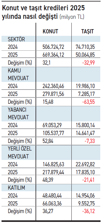 Tüketici kredileri arasında 2025 yılında en zayıf performansı taşıt kredileri gösterirken faiz oranlarının geçmiş yılların üstünde olmasına rağmen konut kredileri reel büyümeye imza attı. Bankadan bankaya değişmekle birlikte en düşük konut kredi faizi yüzde 2,49 ile yıllık bileşik yüzde 34,33’e kadar geriledi. Merkez Bankası’nın ortalama konut kredi faizi verisi ise 30 ayın en düşük faiz oranı yüzde 37,21’e işaret ediyor. Konut kredi bakiyesinde yıllık büyüme ise yüzde 32,1 seviyesinde.